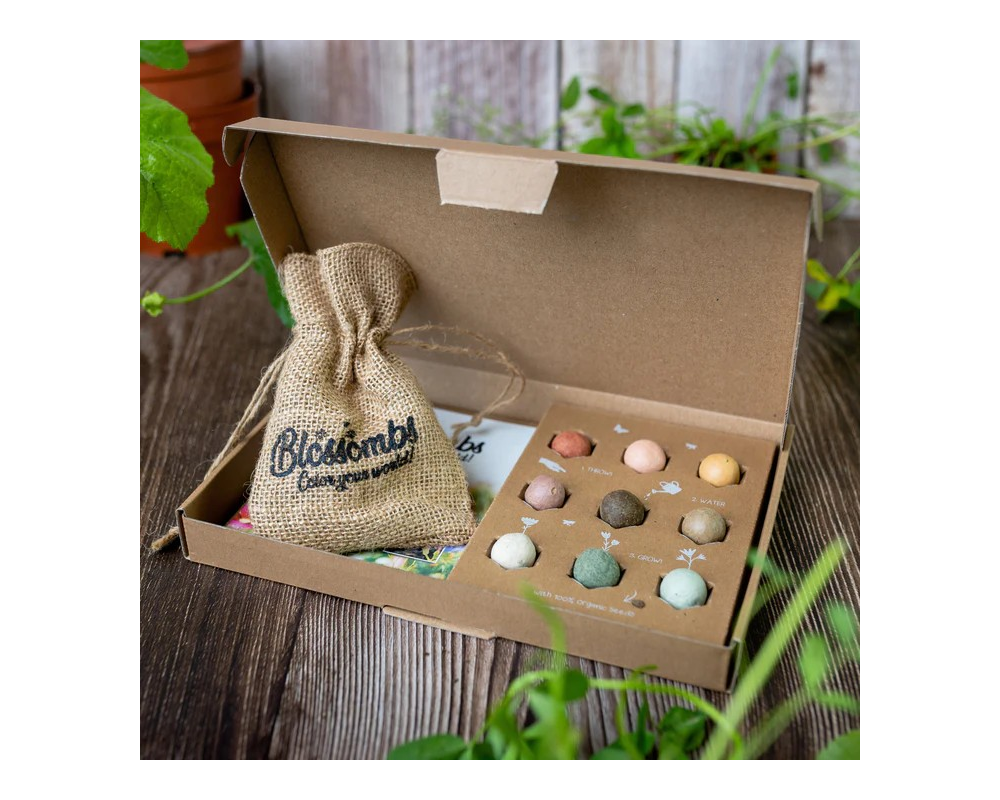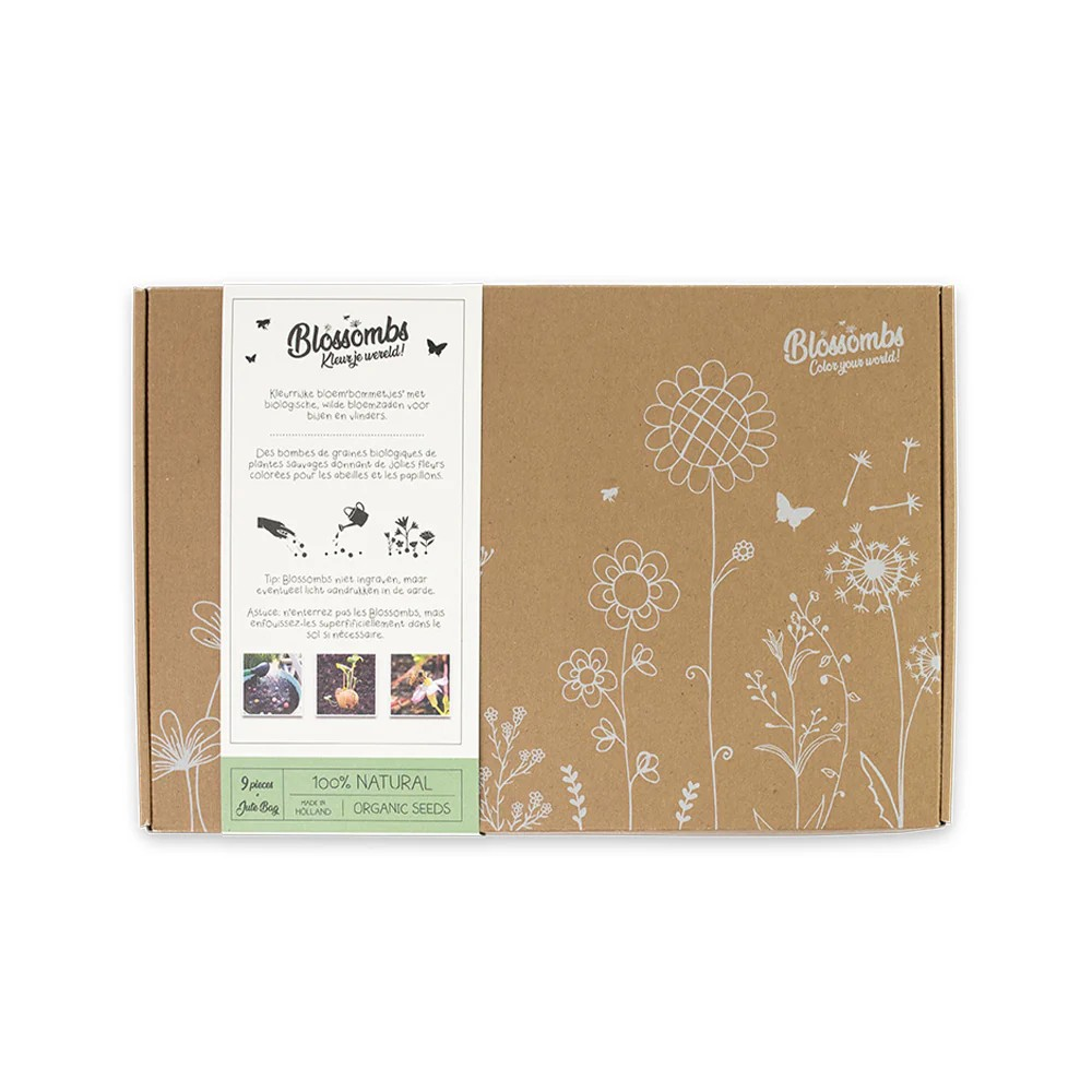 Veľká luxusná darčeková krabička obsahuje 9 ekologických kvetinových bômb Blossombs a praktické jutové vrecúško na ich uskladnenie. Ideálny darček, ktorý možno jednoducho poslať poštou – balenie sa zmestí do poštovej schránky.