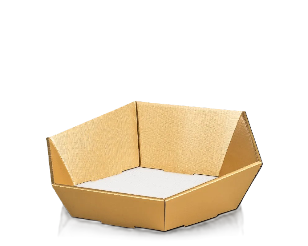 Šesťhranný darčekový košík vyrobený zo štruktúrovaného kartónu s kvalitným povrchom ponúka elegantné a funkčné riešenie na balenie rôznych druhov produktov. Vďaka svojej konštrukcii je dodávaný v plochom stave, čo šetrí skladový priestor, a dá sa rýchlo a jednoducho poskladať.