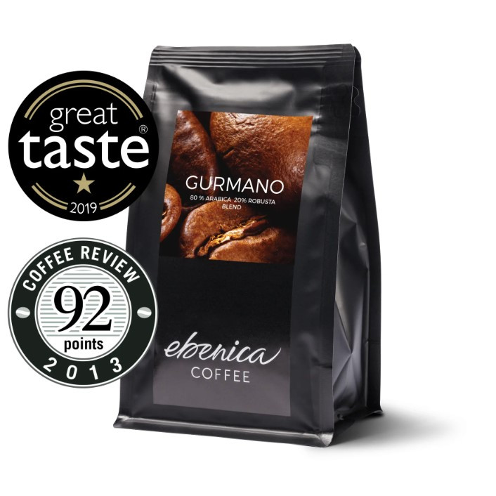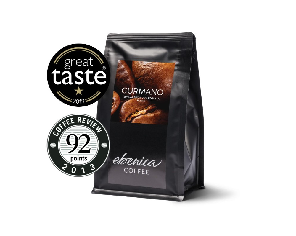 Ebenica Gurmano je unikátny kávový blend, ktorý v sebe dokonale snúbi latinsko-americké kávy Arabica s ázijskou Cherry Robustou v pomere 80:20. Vďaka vyváženej súhre týchto odrôd má káva Gurmano výraznejšie telo a horkejšiu chuť, v ktorej cítiť sýte tóny tmavej čokolády s osviežujúcimi stopami hrozienok a kvetín.