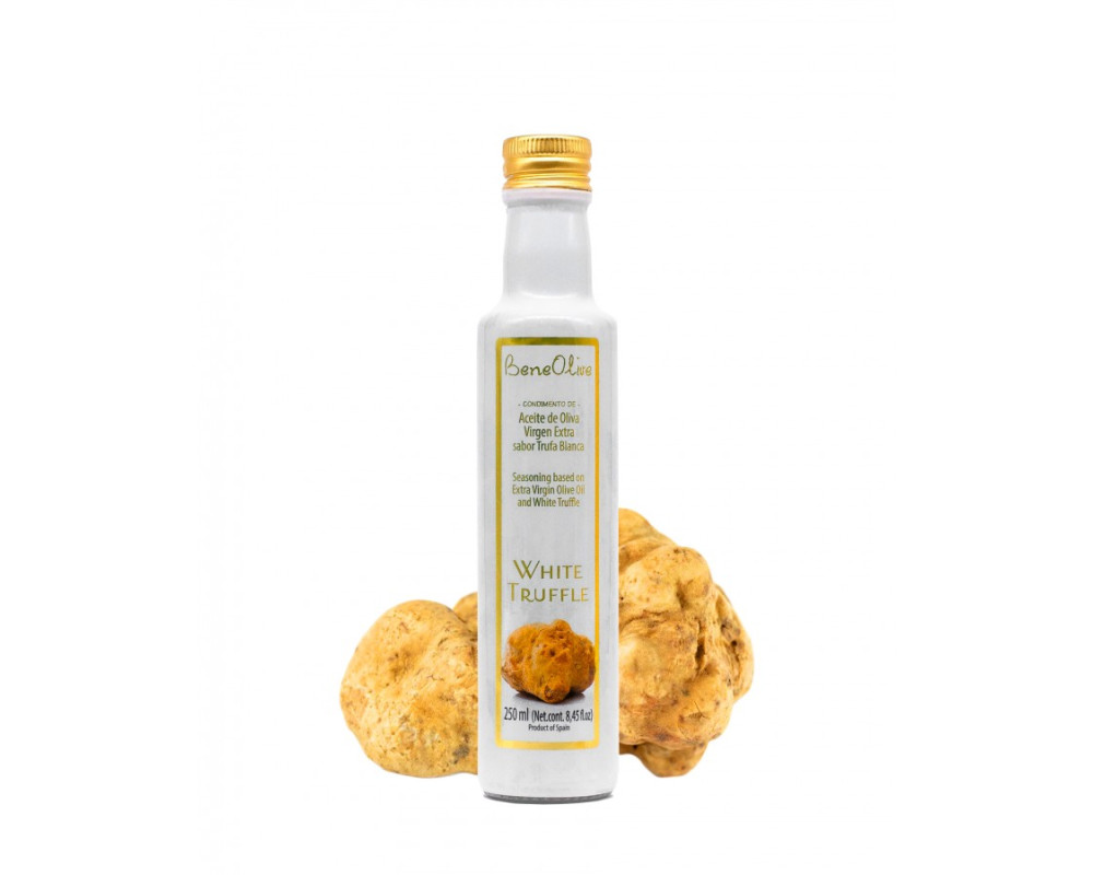 EVOO & Biela hľúzovka – Jemnosť, ktorá zanechá dojem Výnimočný olej, v ktorom sa stretáva extra panenský olivový olej zo slnečného Benejúzaru s noblesou bielej hľuzovky. Výsledkom je delikátny chuťový profil, ktorý je subtílny, no zároveň nezameniteľný. Tento olej ocení každý, kto hľadá eleganciu na tanieri – či už ide o jednoduché cestoviny, jemné carpaccio, krémové polievky alebo len kvapku na čerstvej bagete.