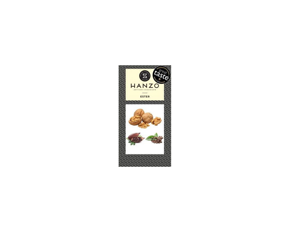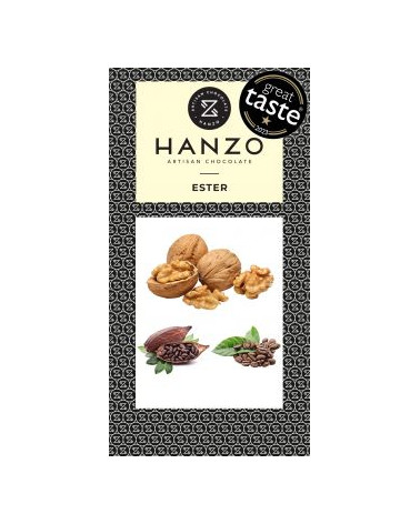Biela čokoláda ESTER od značky HANZO je výnimočná kombinácia jemnej bielej čokolády a gurmánskych ingrediencií. Obsahuje gianduju z vlašských orechov, praženú kávu a chrumkavé kakaové bôby, čo jej dodáva bohatú, no zároveň vyváženú chuť s jemným nádychom orieškov a kávy.