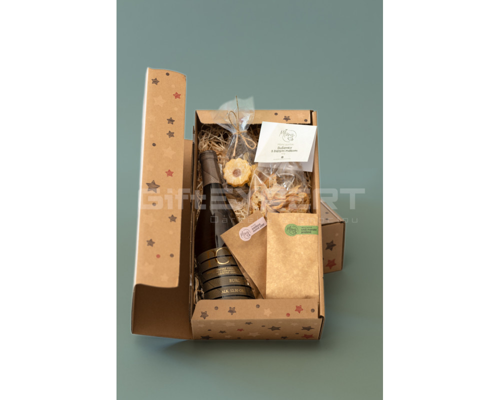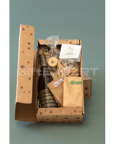 Darčekové balenie, ktoré spája kvalitné slovenské víno, sušienky značky Mlsný jazýček, delikátne dobroty a ekologické balenie do harmonického celku. Vytvorené ako elegantný darček pre sviatočné chvíle, s ohľadom na štýl, chuť a udržateľnosť.