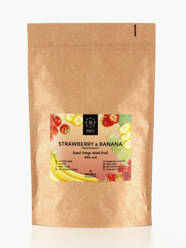 Sladkosť banánu a sviežosť jahody vytvárajú harmonickú chuťovú kombináciu, ideálnu ako zdravá pochúťka, do jogurtov, kaší, smoothies či na pečenie. Každých 110 g mrazom sušeného ovocia je vyrobených z cca 1100 g čerstvého ovocia.