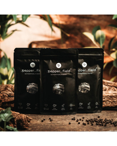Chcete sa nechať okúzliť jedinečnosťou čierneho zlata z Kampotu? Ste na správnej adrese čierne Kampotské korenie vám ponúka možnosť na vlastnej koži zistiť, prečo je toto korenie vyhľadávané najslávnejšími kuchárskymi majstrami z celého sveta. Balenie vám zároveň vytvorí dostatočnú zásobu, ktorá vám v kuchyni nejakú chvíľu vydrží. Vnútri znovu uzatvárateľného balenia, ktoré perfektne uchová celkový charakter svojho obsahu, nájdete zrnká čierneho korenia z kampotských plantáží.