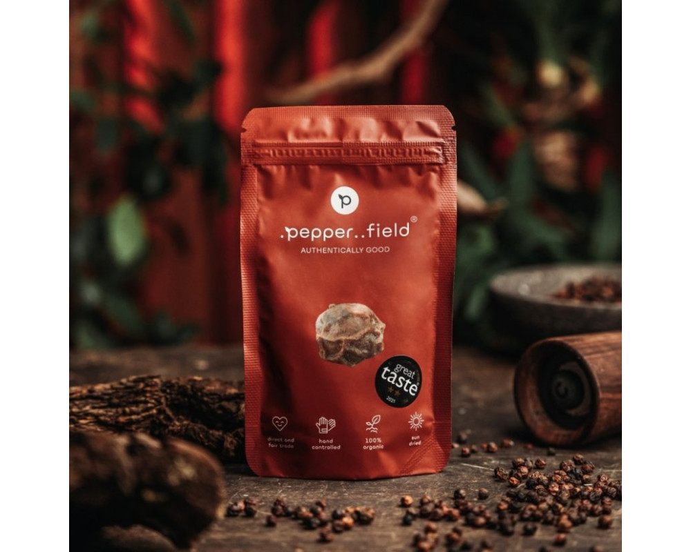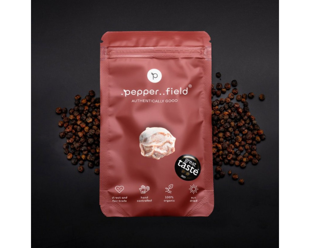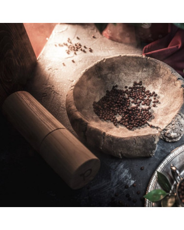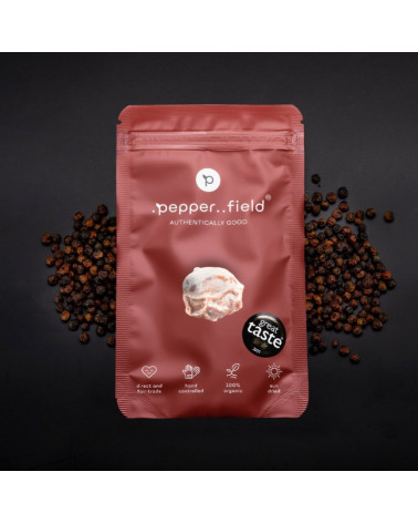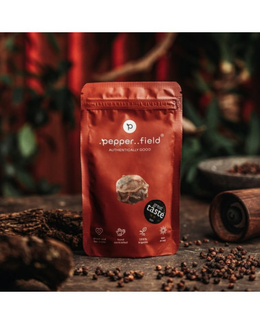 Hľadáte vstupenku do sveta neuveriteľných chutí Kampotu? Potom ste ju práve našli! 20 gramov tmavo červeného Kampotského korenia vám ponúka možnosť na vlastnej koži zistiť, prečo je toto korenie vyhľadávané najslávnejšími kuchárskymi majstrami z celého sveta. Vnútri znovu uzatvárateľného balenia, ktoré perfektne uchová celkový charakter svojho obsahu, nájdete zrnká temne červeného korenia z kampotských plantáží. Jedná sa o tú najvyberanejšiu selekciu najzrelejších zrniek korenia, ktoré pretekajú sladkou fruktózou a intenzívnou ovocnou vôňou. Zrnká sú po zbere sušené na slnku, a tým šupka guličky korenia dostáva svoju charakteristickú zvráskavenú štruktúru. Zrnká korenia exportované na váš stôl pochádzajú z produkcie malých rodinných fariem, ktoré k pestovaniu korenia pristupujú s poctivosťou a tradičnými postupmi, ktoré sú v tejto oblasti využívané stovky rokov.