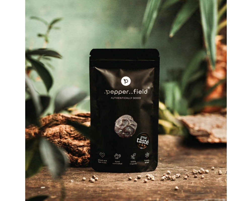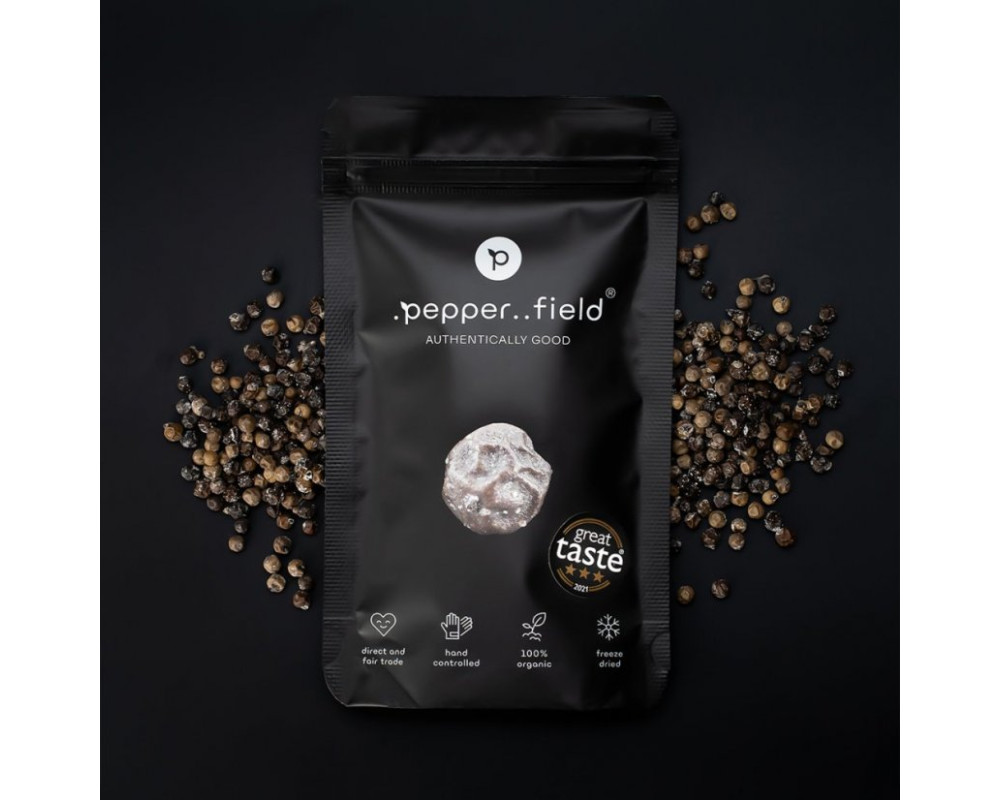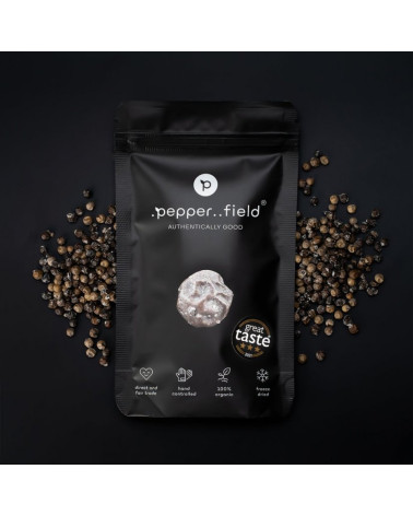 Hľadáte niečo skutočne exkluzívne? Ste na správnej adrese. Práve sa totiž pozeráte na lyofilizované zelené korenie, svetový unikát, ktorý je výsledkom nášho dlhého snaženia, ako až do Európy dovážať delikátnu chuť čerstvo odtrhnutého zeleného korenia z liany pieporu. Toto sa nám nakoniec podarilo dosiahnuť vďaka lyofilizácii, teda hlbokému sušeniu zrniek korenia pomocou mrazu. Vďaka tomuto procesu si korenie uchová maximálnu kvalitu a autentickú chuť, ktorá je neporovnateľná s akýmikoľvek inými druhmi korenia. Naviac je jemne nasolené, takže dodá vášmu jedlu skvelú chuť.