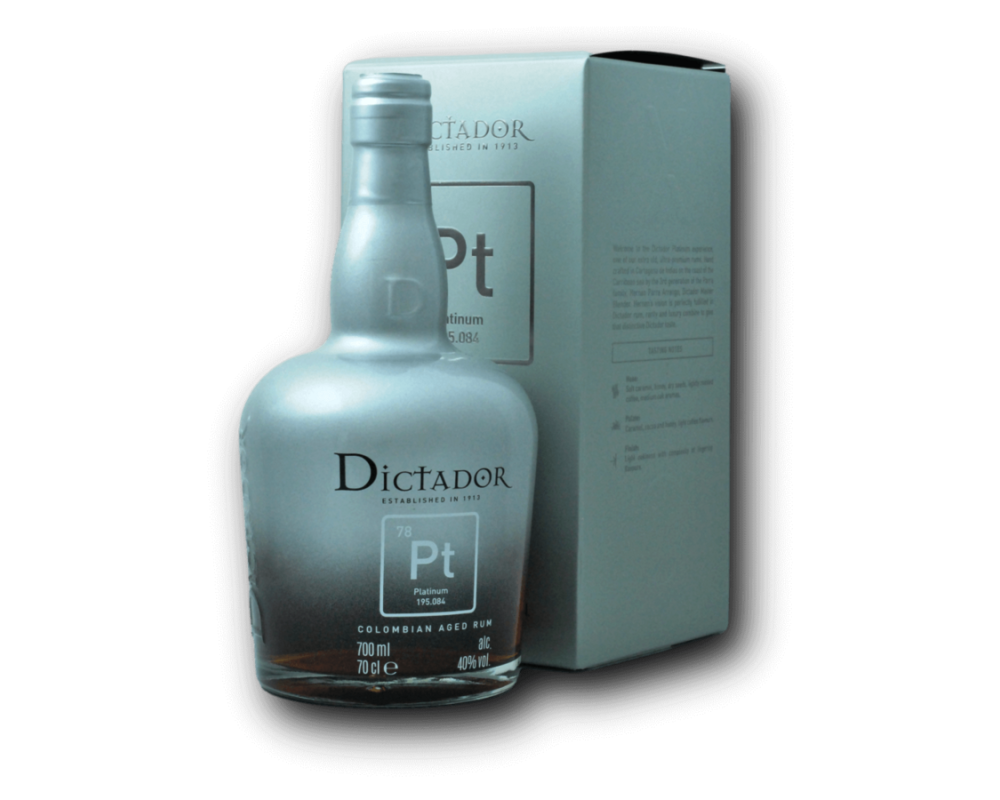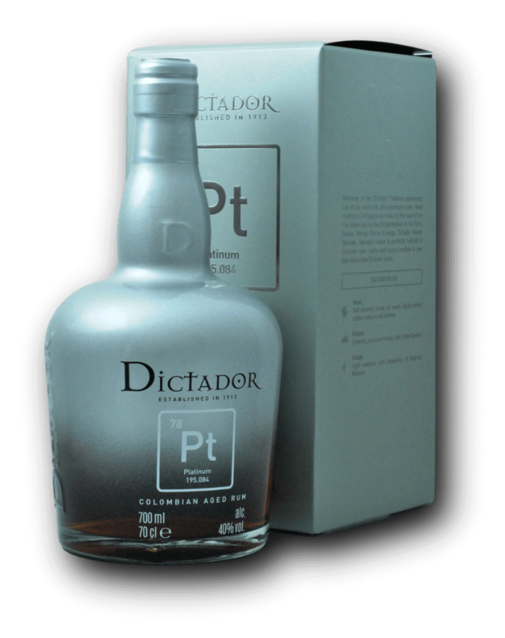 Niektoré rumy rozprávajú príbehy. Dictador Platinum ich šepká – v tónoch medu, kávy a vanilky, ktoré sa rodia v tme kolumbijských pivníc. Tento rum vzniká z panenského medu z cukrovej trstiny, fermentovaného a destilovaného v antickom medenom alembiku, ktorý dodáva destilátu jemnosť a charakter.