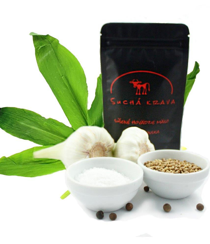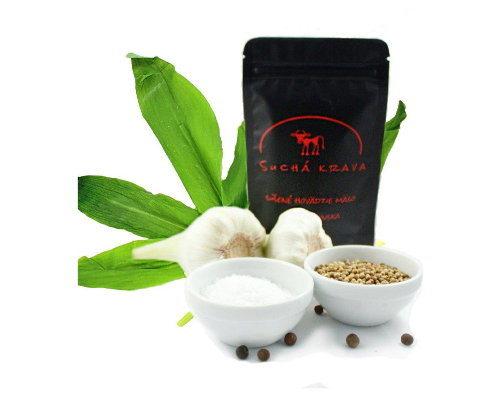 Hovädzie mäso s jarným dotykom prírody – táto sušená pochúťka spája intenzívnu chuť hovädzieho mäsa s jemne pikantnou a aromatickou stopou medvedieho cesnaku. Pripomína prechádzku lesom, kde sa vôňa čerstvých listov mieša s vôňou dymu. Vyrobená z 320 g surového hovädzieho mäsa na 100 g hotového výrobku, tepelne opracovaná, trvanlivá, ideálna ako snack na cesty, k pivu alebo ako súčasť darčekového balenia pre milovníkov prírodných chutí. Bez lepku, bez alergénov, len mäso, korenie a štipka divokej jari.