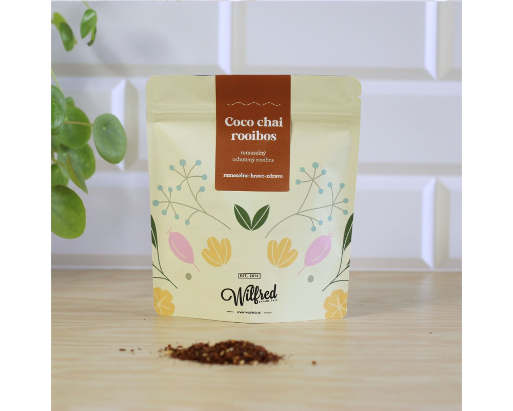 Správne korenistý, trochu exotický a s nádychom kokosu. Taký je Coco chai rooibos. Výborne sa hodí pri výrobe bezkofeinového chai latte, ale výborne chutí aj samotne. Zázvor, škorica, klinčeky a ružové korenie sú hlavné indegrediencie, ktoré majú na starosti jeho ľahko pikanto-korenistú chuť.