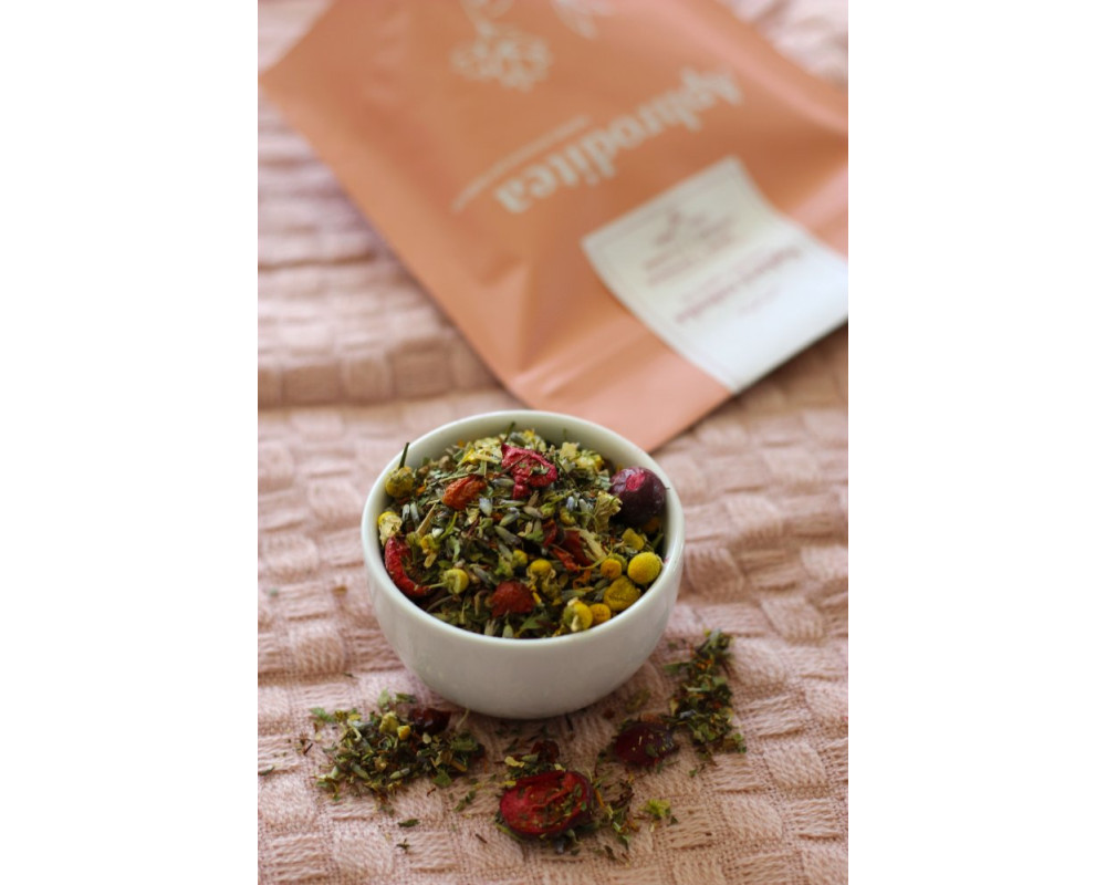 Zloženie: rooibos, harmanček, šípky, verbena, mäta, valeriána, levanduľa, brusnice