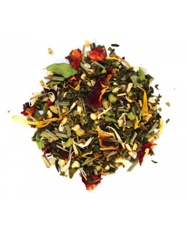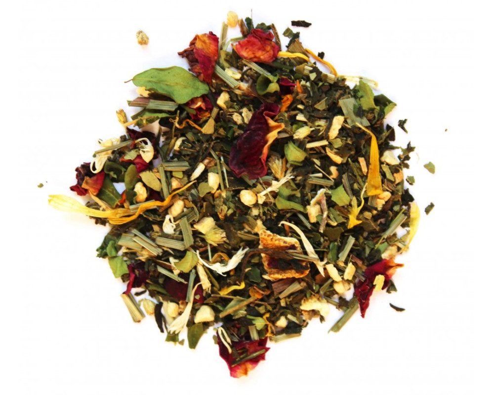 Zloženie: zelený čaj, zázvor, žihlava, citrónová tráva, verbena, maté, moringa, pu er, pomarančová kôra, nechtík, ruže, prírodná aróma