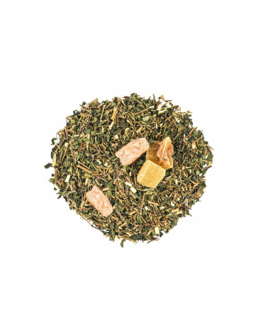 Sme hrdí, že vám môžeme ponúknuť zmes, ktorá chutí rovnako výborne ľadovo vychladená aj horúca. Zelený nefermentovaný rooibos je plný antioxidantov, minerálov a vitamínu C. Aby bola zmes dokonale vyvážená pridali sme ešte štipku marockej mäty a šťavnatého manga. Jednoducho zdravá osviežujúca exotika.
