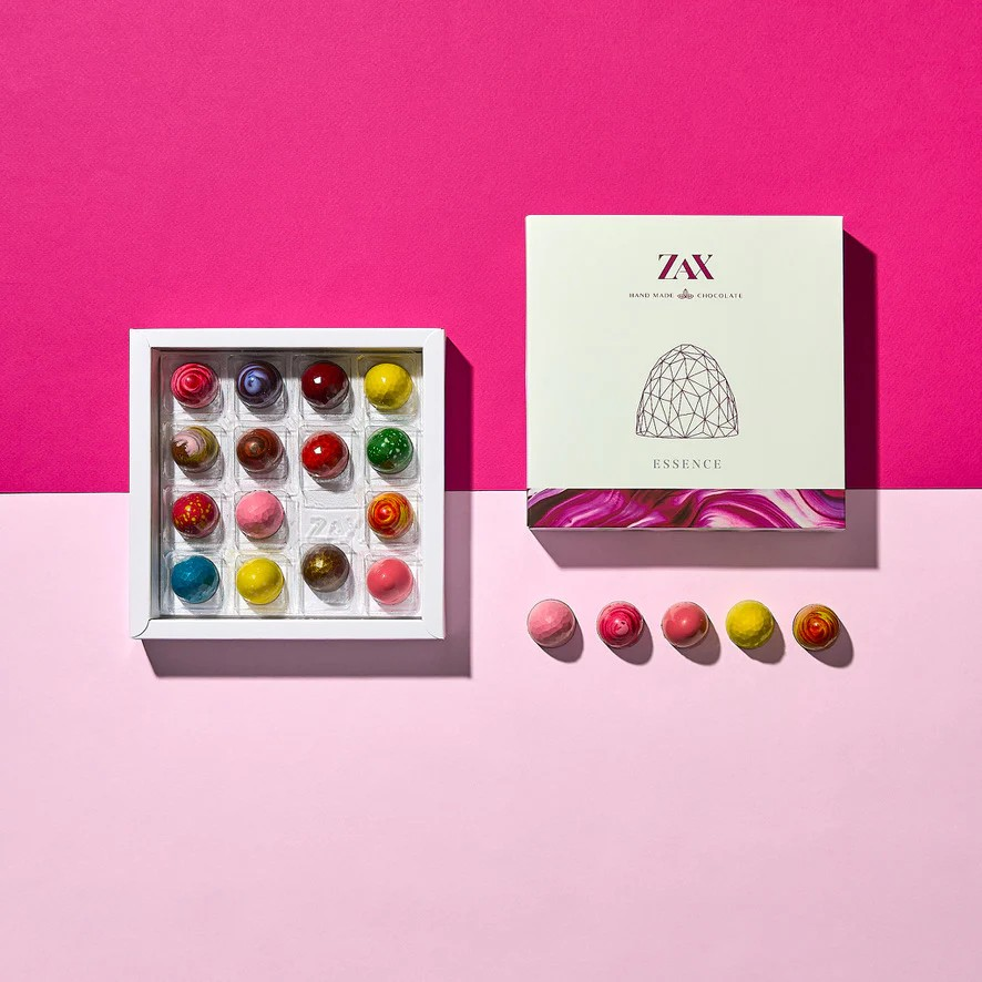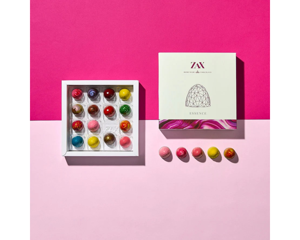 Čokoládová dielňa ZAX týmito prémiovými pralinkami plnenými rôznymi ingredienciami veľkolepo definuje ako môže vyzerať a chutiť inovácia vo svete praliniek. Dokonale tenká chrumkavá čokoládová šupka, ktorej ručne maľovaný povrch ukrýva krémovú plnku až 40-ich kombináciach sa len tak rozplýva na jazyku. Dokonalá harmónia medzi sviežosťou plniek a sladkosťou čokolády vám prinesie nezabudnuteľný gurmánsky zážitok.