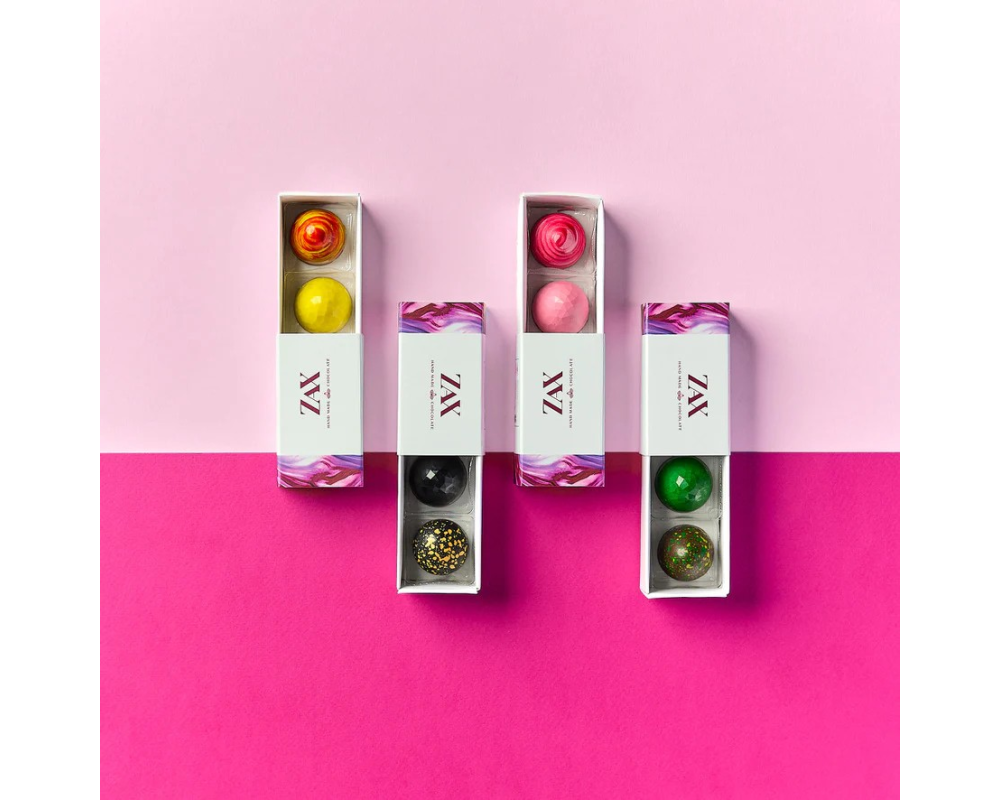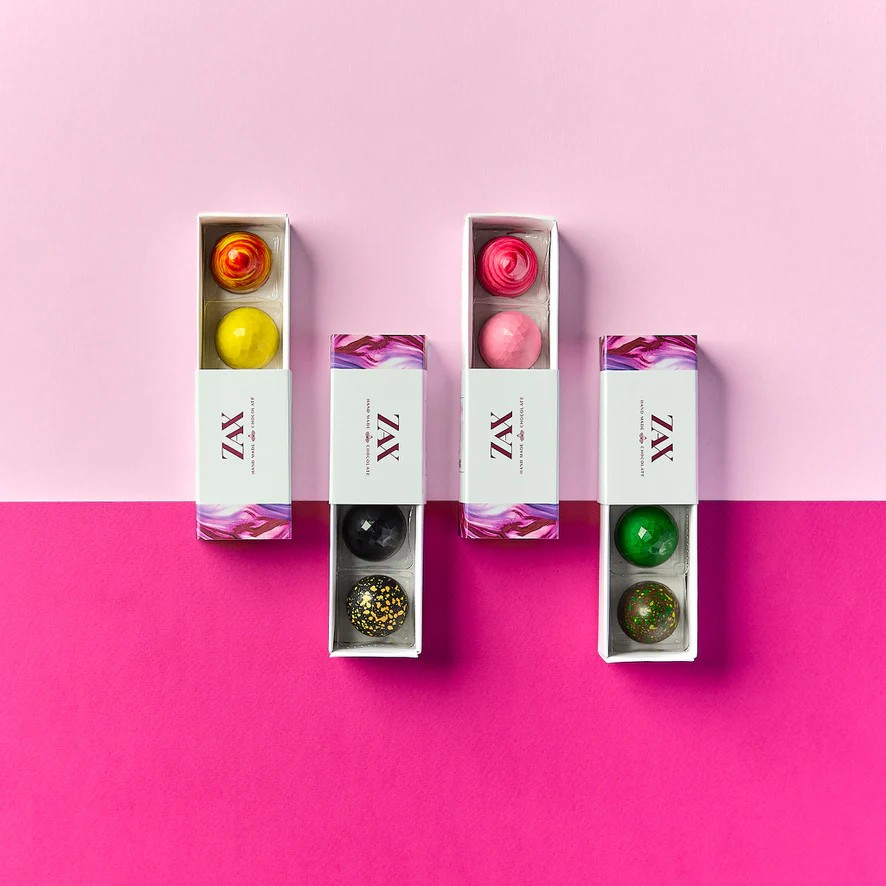 Čokoládová dielňa ZAX týmito prémiovými pralinkami plnenými rôznymi ingredienciami veľkolepo definuje ako môže vyzerať a chutiť inovácia vo svete praliniek. Dokonale tenká chrumkavá čokoládová šupka, ktorej ručne maľovaný povrch ukrýva krémovú plnku až 40-ich kombináciach sa len tak rozplýva na jazyku. Dokonalá harmónia medzi sviežosťou plniek a sladkosťou čokolády vám prinesie nezabudnuteľný gurmánsky zážitok.